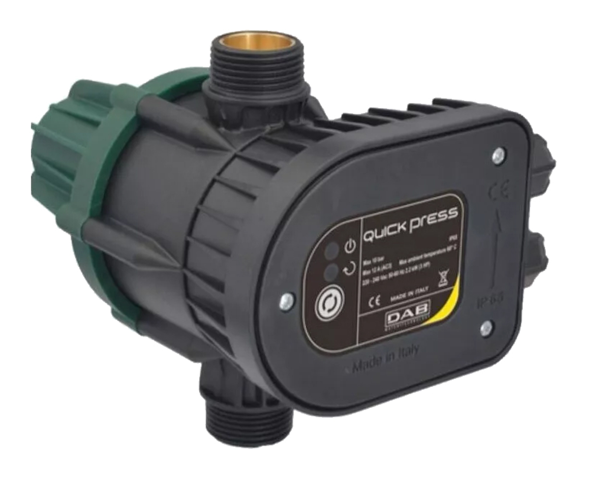Quick Press Presscontrol di Dab è un dispositivo on/off che controlla la corretta accensione o l’arresto dell'elettropompa in funzione della richiesta. Il Presscontrol Quick press arresta la pompa in caso di mancanza d’acqua e la protegge dalla marcia a secco. Può essere montato su varie tipologie di Elettropompe, sia di superficie che su pompe sommerse. Il dispositivo è compatto ed affidabile, dedicato soprattutto ad applicazioni residenziali.